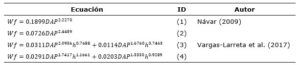 La biomasa del fuste se estimó mediante los datos de diámetro y altura, con modelos alométricos desarrollados para Pinus cooperi. Se utilizó la ecuación de Návar (2009), basada únicamente en el DAP (Ecuación 1), y la de Vargas-Larreta et al. (2017) que incorpora la altura h (Ecuación 3). Adicionalmente se consideraron los modelos genéricos sugeridos por ambos autores para todas las especies de pino (ecuaciones 2 y 4). Las expresiones utilizadas se presentan en el Cuadro 1.