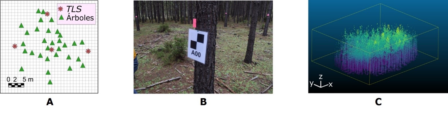 A = Distribución espacial de los árboles y dispositivo TLS; B = Objetivo reflectante en el árbol; C = Nube de puntos fusionada.