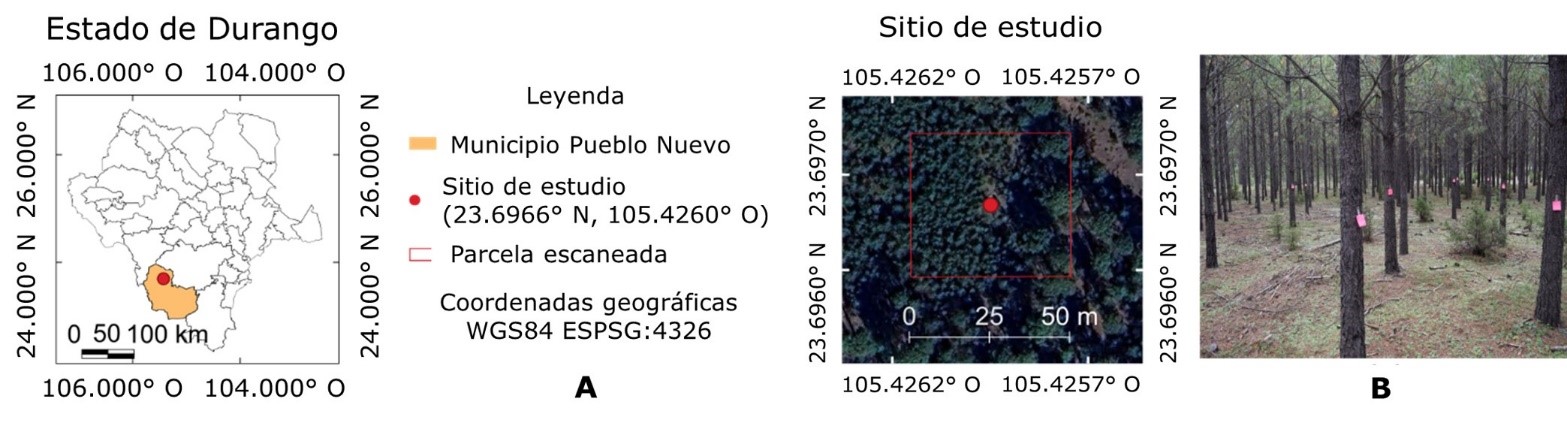 El estudio se realizó en un sitio con una masa forestal regular de Pinus cooperi C. E. Blanco, con una dimensión de 50×50 metros y una densidad de 960 árboles ha-1, ubicado en el ejido La Victoria, municipio Pueblo Nuevo, Durango, México (Figura 1A). El sitio se estableció bajo la metodología desarrollada por la Forestry Commission (Hummel et al., 1959). En esta, las áreas homogéneas se dividen en parcelas que pueden variar entre 1 200 y 4 000 m2; en donde los árboles se numeran y miden periódicamente para monitorear su crecimiento. En el área de estudio se presenta un clima templado subhúmedo y semifrío subhúmedo (García, 2004), con temperatura media anual de 20 a 22 °C, y precipitación anual que oscila entre 800 y 1 200 mm.
