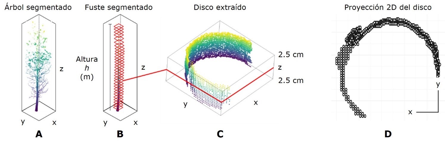 A = Árbol segmentado; B = Fuste segmentado; C = Ejemplo de extracción de discos; D = Circunferencia bidimensional.