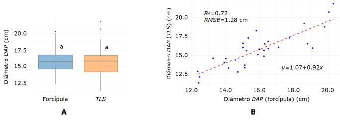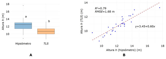 El análisis de la variable h obtenida del hipsómetro y de la nube de puntos del TLS estimó una media de 12.29 m y 10.82 m, respectivamente (Cuadro 2). La prueba de Shapiro-Wilk confirmó la normalidad de los datos en ambos métodos (p=0.1168 y p=0.9113), y la prueba de Levene indicó homogeneidad de varianzas (p=0.1569). Bajo estos supuestos, la prueba t de Student mostró diferencias significativas entre ambos métodos (t=-4.1464, p=0.0001). Lo que confirma la Figura 4A. El RMSE del TLS, con respecto al hipsómetro es de 1.68 m con un R2 de 0.79, lo cual es evidente en el gráfico de dispersión de la Figura 4B.