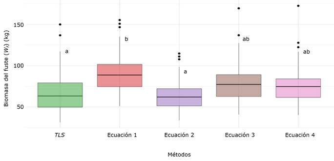 Los valores de biomasa obtenidos con TLS tuvieron una media de 68.78 kg, con una tendencia a subestimar los valores en comparación con los métodos alométricos tradicionales (Cuadro 6), debido a la subestimación de la altura. Por último, el análisis indicó que los datos de biomasa no siguen una distribución normal, según la prueba de Shapiro-Wilk (p<0.05). La prueba no paramétrica de Kruskal-Wallis confirmó diferencias significativas entre los métodos evaluados (X2=20.18, p=0.001). El análisis post hoc de Dunn, con corrección de Bonferroni, reveló que las estimaciones de biomasa mediante TLS difieren significativamente de las obtenidas con la Ecuación 1 (p=0.0015), pero no de los otros métodos (p>0.05). De acuerdo con este análisis, el TLS y la Ecuación 2 pertenecen al grupo “a”; tanto la Ecuación 3 y 4 están en una posición intermedia, dentro del grupo “ab” (Figura 7). Aunque los resultados apuntan a que el TLS estima la biomasa dentro de los intervalos esperados, no son concluyentes, ya que deberían considerarse otros factores como el error citado por Návar (2009) y el error acumulativo presente en las ecuaciones de Vargas-Larreta et al. (2017).
