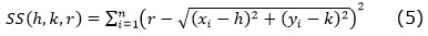 El diámetro de cada proyección se calculó ajustando una circunferencia a los puntos contenidos en su respectivo plano, definida por su centro (h, k) y su radio (r). Este ajuste se planteó como un problema de optimización; se minimizó el error cuadrático entre los puntos y la circunferencia propuesta, mediante la función objetivo (Ecuación 5) de Umbach y Jones (2003):