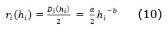 El Volumen del fuste (Vf) se calculó integrando el área transversal A(hi) a partir de la Ecuación 9. El radio del segmento en función de la altura hi se define como: