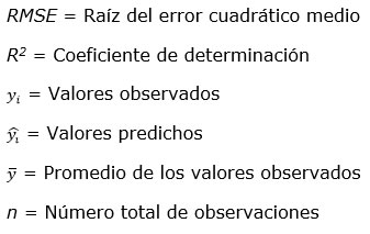 Se evaluó la normalidad de los datos de diámetro (DAP), altura (h) y biomasa (Wf) con la prueba de Shapiro-Wilk, para ello se utilizaron tanto los valores de los instrumentos tradicionales, como del TLS. El diámetro y la altura siguieron una distribución normal en ambos métodos. Tras evaluar la homogeneidad de varianzas con la prueba de Levene, se compararon sus medias mediante la prueba t de Student con 95 % de confianza. Para la biomasa, al no ser normal, se aplicó la prueba de Kruskal-Wallis y un análisis post hoc de Dunn con corrección de Bonferroni (Haynes, 2013), en el paquete dunn.test versión 1.3.6 (Dinno, 2024) y un intervalo de confianza de 95 %. Además, se calcularon el RMSE (Ecuación 15) y R2 (Ecuación 16) para el diámetro y la altura. Se asumió que los valores observados del DAP y la altura correspondían a las mediciones con forcípula e hipsómetro, y los valores predichos se estimaron con TLS.