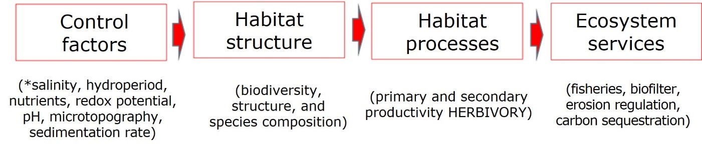 Habitat structure and control factors that give rise to various processes in the habitat, resulting in various ecosystem services.