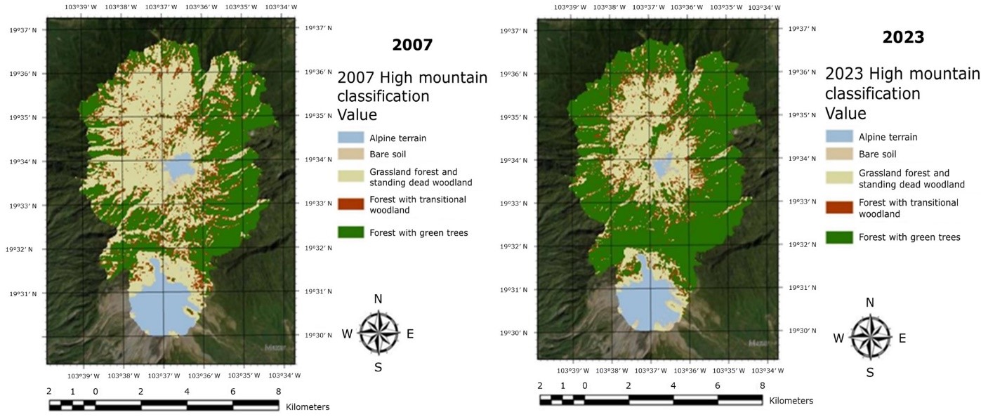 At the Nevado de Colima Volcano National Park (PNVNC, for its Spanish acronym), the management of pests such as pine bark beetle insects follows regulations that establish specific measures for their prevention, control, and handling (Conafor, 2015). Between 1963 and 2003, the Pinus hartwegii Lindl. forests of the PNVNC underwent annual clear-cutting to combat pine bark beetle insects in accordance with current regulations. However, since 2004, those responsible for the park's management program (Comisión Nacional de Áreas Naturales Protegidas [Conanp], 2006) have questioned the effectiveness of these practices and pointed out the annual recurrence of the pest, as well as the associated damages, such as soil erosion, loss of forest mass, organic matter and bird species, and soil degradation (Jones et al., 2025; Sánchez-Ramos et al., 2022; Villalobos, 2021). In response, they suspended sanitation and adopted strategies such as reforestation, livestock eradication, fire management, park use limitations, and water resource management. These actions resulted in a 24.9 % increase in the forest area, according to satellite evaluations conducted between 1999 and 2023 (Villalobos Echevarría, 2023) (Figure 3).