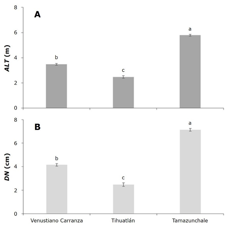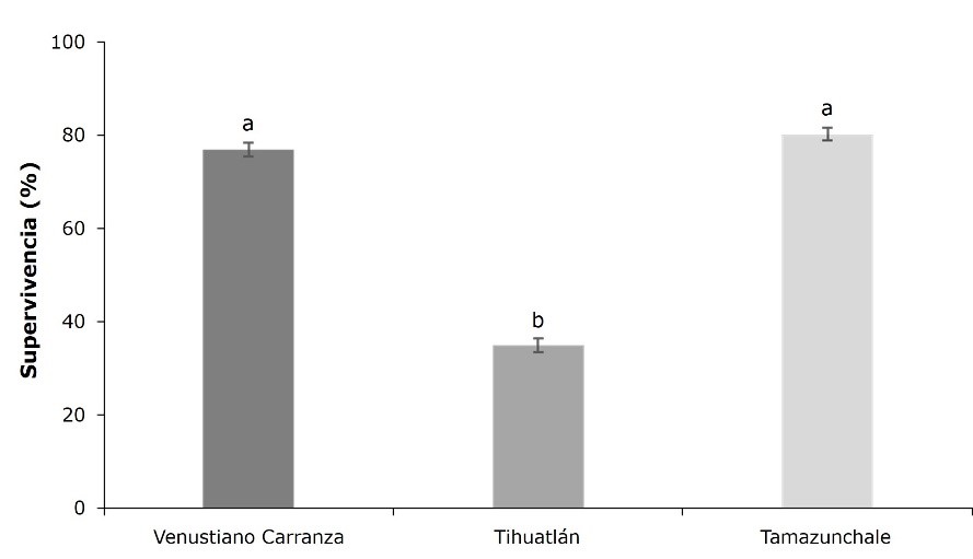 El porcentaje promedio de supervivencia entre los tres ensayos fue superior a 60 %. Los árboles de los ensayos de Venustiano Carranza y Tamazunchale tuvieron mayor supervivencia (>70 %) que los de Tihuatlán (35 %) (Figura 1). En estudios anteriores se ha observado que la mortalidad en las plantaciones está, principalmente, asociada con las condiciones ambientales y prácticas de silvicultura de cada sitio, así como con la falta de protección adecuada (Grignola et al., 2014).