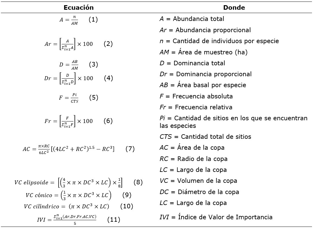 Cuadro 2. Ecuaciones utilizadas para calcular la estructura y composición de la vegetación en las zonas urbanas de la ciudad de Pampas, Huancavelica, Perú.