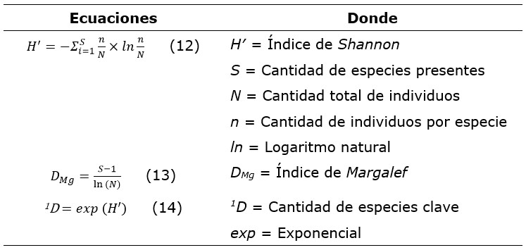 En el Cuadro 3 se presentan las ecuaciones para calcular la riqueza y diversidad de especies mediante el Índice de diversidad de Shannon, el Índice de Margalef y la cantidad de especies clave (Cultid-Medina & Escobar, 2019; Jost, 2006; Leal Elizondo et al., 2018).