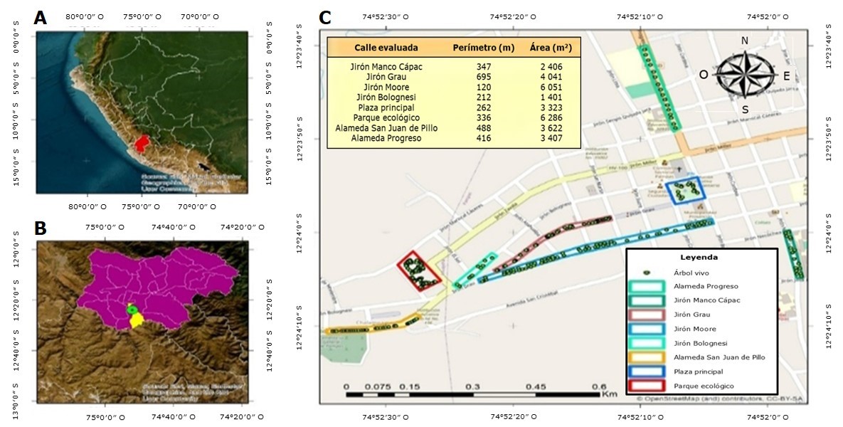 A = Mapa de Perú resaltando Huancavelica; B = Mapa de Huancavelica resaltando Pampas; C = Ubicación de las zonas verdes de la ciudad de Pampas.