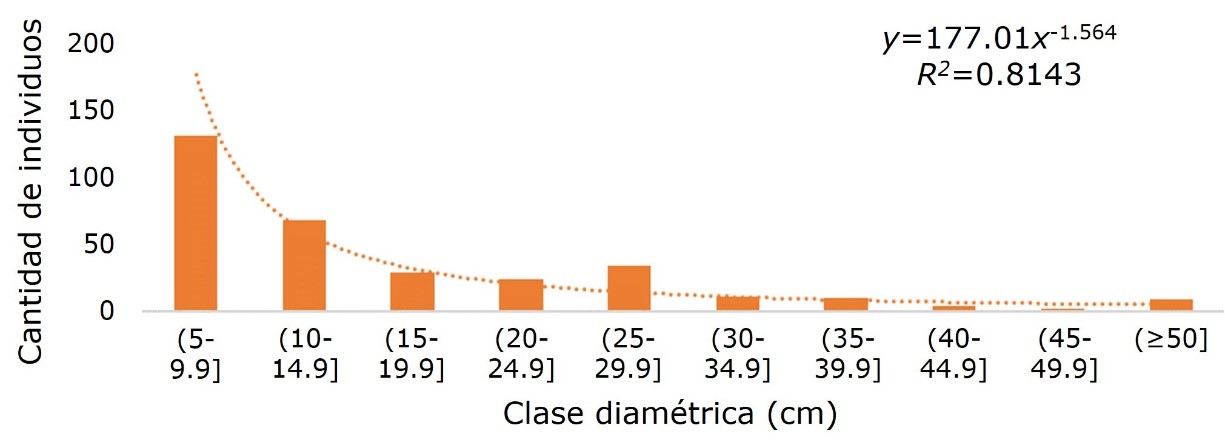 El gráfico de clases diamétricas presentó una tendencia logarítmica (Figura 2), en la que disminuyó la cantidad de individuos al aumentar el diámetro (Figura 2). Se observaron 307 individuos con diámetros normales menores a 40 cm. Si se considera que el diámetro indica el estado de desarrollo del arbolado y de los arbustos urbanos, la mayoría está compuesta por ejemplares jóvenes.