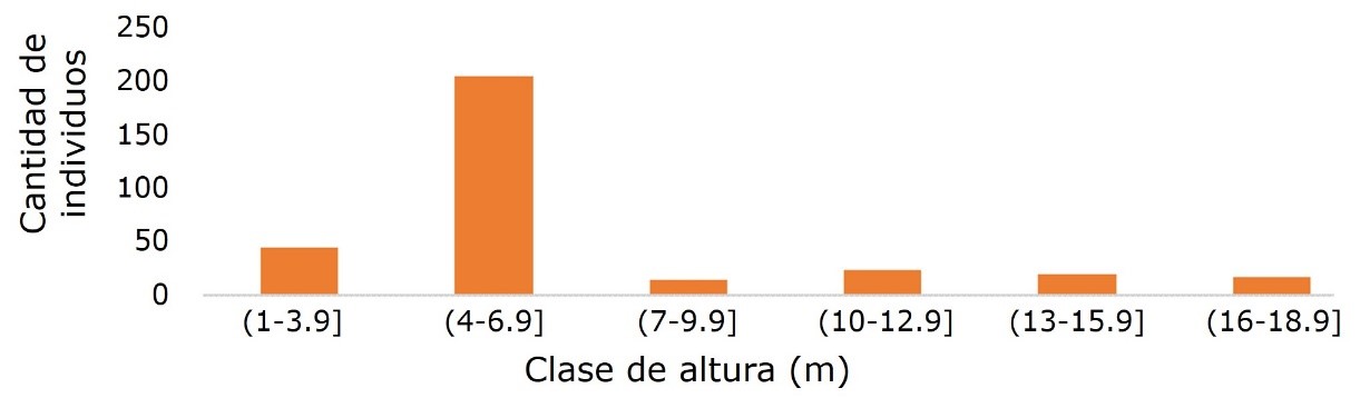 La distribución de las barras del gráfico de clases de altura (Figura 3) no evidenció una tendencia; se observó una alta cantidad de individuos en la categoría de 4-6.9 m y baja en el resto de las categorías. Se registró una desaceleración en el crecimiento de los individuos evaluados, lo que reflejó un crecimiento no constante. Se tuvieron 248 individuos con alturas menores a 7 m.