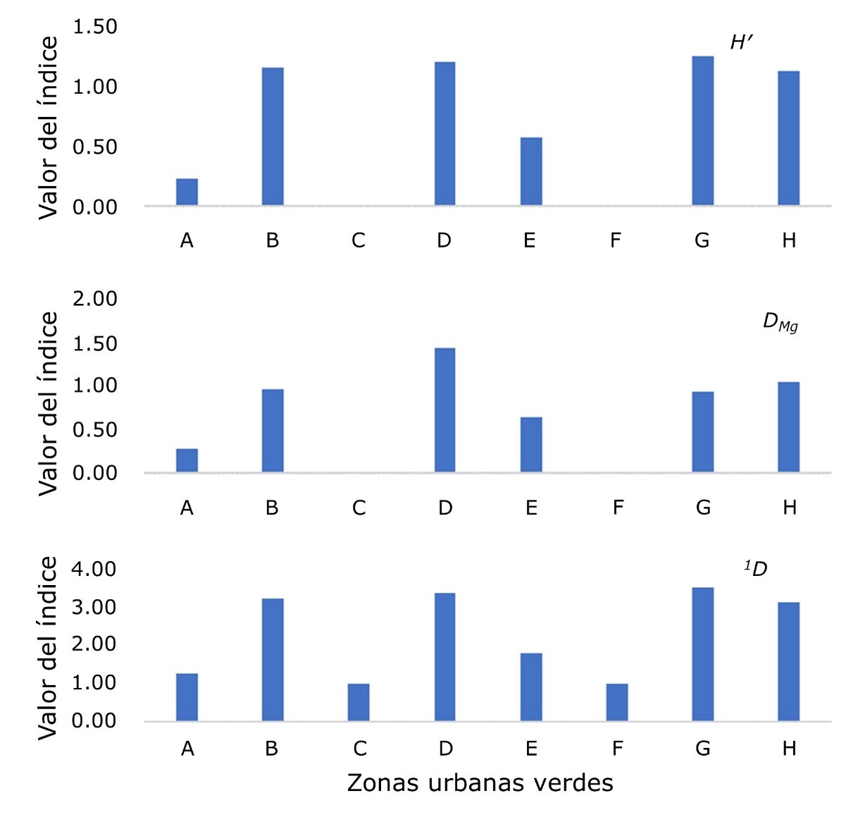 Figura 4. Índices de riqueza y diversidad evaluados en ocho zonas urbanas verdes de la ciudad de Pampas, Huancavelica, Perú.