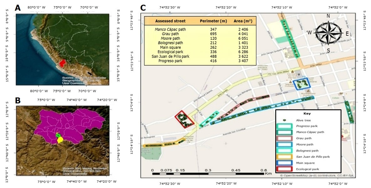 A = Map of Peru highlighting Huancavelica; B = Map of Huancavelica highlighting Pampas; C = Location of green areas in the city of Pampas.