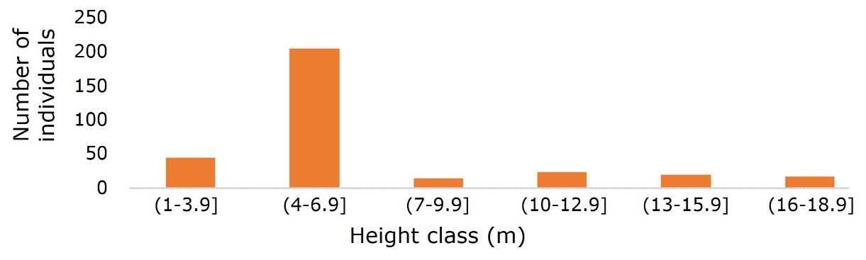 The distribution of the bars in the height class graph (Figure 3) did not show a tendency; there were a large number of individuals in the 4-6.9 m category and a small number in the rest of the categories. There was a deceleration in the growth of the evaluated individuals, which reflects a non-constant growth rate. There were 248 individuals with heights of less than 7 m.
