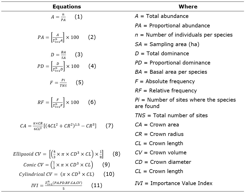Table 2 shows the equations to calculate the absolute and proportional abundance of each taxon according to the number of individuals recorded; the absolute and proportional dominance of each species according to the basal area of the individuals; the absolute and proportional frequency, according to the presence in the eight green urban areas; the crown area, the most active area that assimilates the light radiation, which included the lateral area of the crown and the area of the crown reflection was eliminated (Rodríguez-Laguna et al., 2009); for crown volume, we considered the shape of the crowns (elliptical, conical or cylindrical), which serve as a reference for the production of living matter and ecosystem functions, such as air pollution reduction and carbon sequestration (Fernández-Sarría et al., 2013; Hecht et al., 2008; Korhonen et al., 2013; McPherson & Rowntree, 1988; Meng et al., 2007; Mõttus et al., 2006; Zhu et al., 2021). The contextualized variables were used to obtain the Importance Value Index (percentage ranging from 0 to 100; IVI); the importance of each species was ranked based on abundance, frequency, dominance, area and crown volume (Saavedra-Romero et al., 2019).