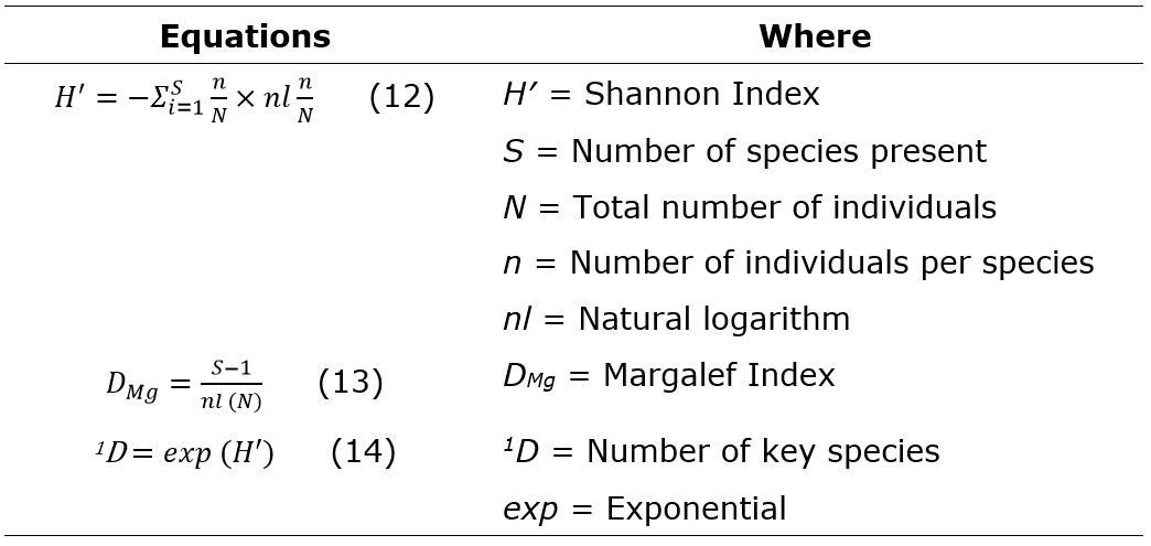 Table 3 presents the equations for calculating species richness and diversity using the Shannon diversity Index, the Margalef Index, and the number of keystone species (Cultid-Medina & Escobar, 2019; Jost, 2006; Leal Elizondo et al., 2018).
