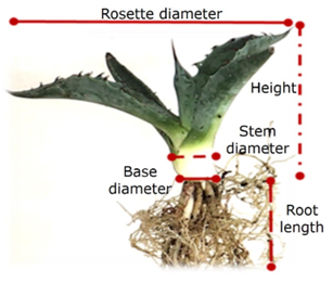 The plant was evaluated nine months after planting. Ten central plants were removed from each replicate (a 54-well tray) to avoid edge effects (40 plants in total per treatment). The root substrate was removed with water to avoid damaging the roots. The height (cm), root length (cm), and rosette diameter (cm) were then determined using a model RAS-30 PILOT® graduated ruler; the root base diameter (mm) and stem diameter (mm) were determined using a model CAL-6MP Truper® digital caliper; and the dry biomass of the shoot and root portion (g) were determined (Figure 1).