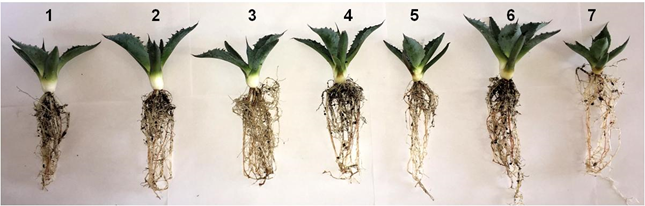 Table 3. Root height and length of Agave durangensis Gentry with various substrate mixtures, nine months after planting.