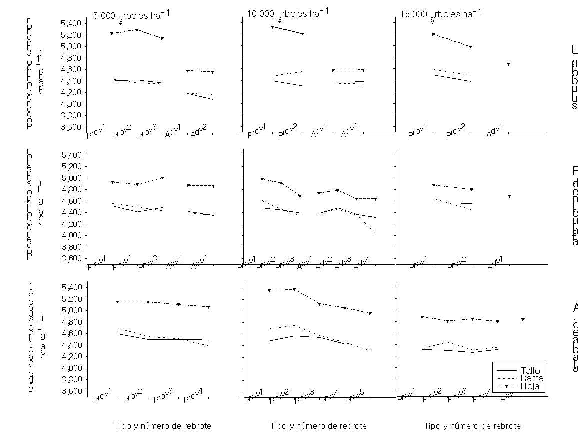 El poder calorífico en tocones rebrotados presentó diferencias en sus vástagos dominantes (proventicios) y codominantes (adventicios). Los dos vástagos proventicios dominantes (Prov 1 y Prov 2, con valores altos de Dac y altura) registraron el poder calorífico más alto en tallos, ramas y hojas, con una tendencia a disminuir según su vigorosidad dentro del tocón (Figura 2). La especie con mayor variación fue E. globulus, con una disminución hasta de 641.9 kcal kg-1 PCS en hojas, y 214 kcal kg-1 en tallos y ramas (Figura 2). La densidad de plantación careció de influencia significativa directa sobre el poder calorífico, bajo el sistema de rotación corta.