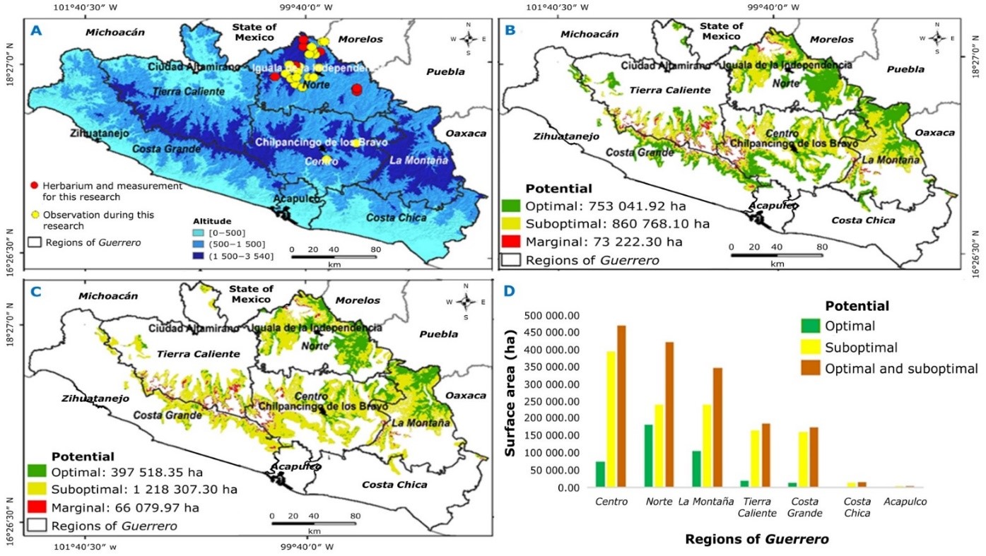 The study identified 397 518.35 ha (6.25 % of Guerrero) with optimal agroecological potential for A. rhodacantha, concentrated in the Norte, La Montaña, and Centro regions of the state under specific conditions: a warm subhumid climate; an altitude of 800-1 400 masl, and 600-1 200 mm rainfall. The evaluation of the GIS model predictions showed high reliability (83.33 % overall accuracy; 91.67 % sensitivity), supporting its use for planning sustainable crops in already degraded areas. The scarcity of existing plantations represents a strategic opportunity for differentiated markets, given the unique organoleptic quality of mezcal from the Crimson Spire agave. However, the declining trend in their wild populations requires immediate genetic conservation measures and taxonomic studies to ensure their preservation.