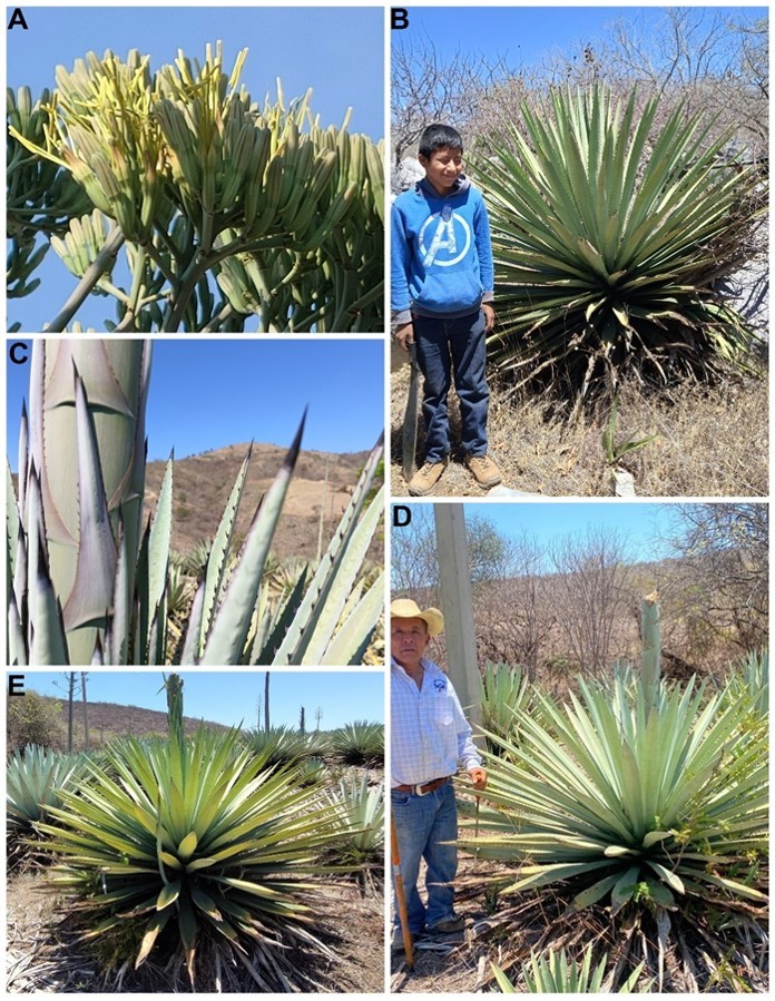 A = Flowers from an adult specimen in a plantation, San Martin Pachivia locality, Ixcateopan de Cuauhtémoc; B = Wild juvenile specimen, San Martín Pachivia locality; C = Detail of thorns and bracts, San Martín Pachivia locality; D = Adult specimen in plantation ready for harvest, Tuzantlán locality, Atenango del Río; E = Adult specimen in plantation beginning to form a quiote, Tuzantlán locality.