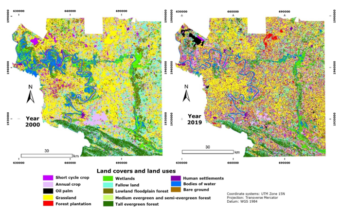 Short-cycle crops: their vegetative cycle lasts less than a year, like those of corn, beans, etc.; annual crops: crops with a vegetative cycle lasting 12 to 24 months, like the sugar cane; oil palm: an agro-industrial oilseed crop for oil production; grassland: naturally occurring or induced herbaceous communities of grasses; forest plantation: species cultivated for timber or resin production; wetlands: aquatic, rooted, and floating plant communities; fallow lands: the successional phase of removed or disturbed vegetation; lowland floodplain forest: vegetation less than 15 m tall that grows on temporarily or permanently flooded soils; medium-sized evergreen and semi-evergreen forest: tree associations in tropical climates, 50-75 % of whose species lose their leaves during part of the year; tall evergreen forest: tropical plant associations, more than 75 % of whose species retain their foliage throughout the year; bodies of water: rivers, lakes, lagoons, etc.; bare ground: areas devoid of vegetation; human settlements: establishment of a demographic conglomerate (Instituto Nacional de Estadística, Geografía e Informática [INEGI], 2017).