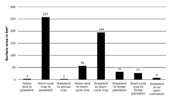 Fallow lands tend to be converted into short-cycle crops and grassland (Figure 5). It is important to note that fallowing is one of the cultural practices of producers in ET, which involves allowing the land to rest (for the fallow land to develop) during a certain period of time, so that the soil may recover its fertility and regain favorable conditions for agriculture to be practiced (Licona & Estupiñan, 2019).