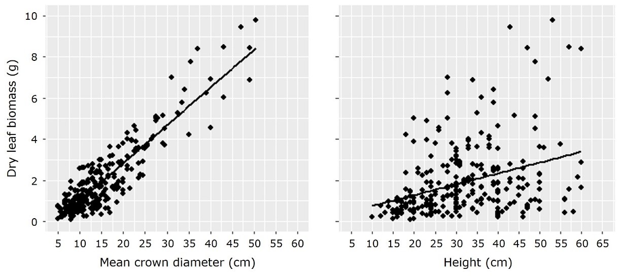 Figure 2. Distribution of the leaf biomass in relation to the mean crown diameter and height of Poliomintha longiflora A. Gray in Cuauhtémoc ejido in Saltillo municipality, Coahuila and La Negrita ejido in Guadalcázar municipality, San Luis Potosí.