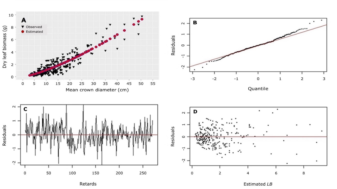 The findings derived from the regression model indicated a significant correlation between the mean MCD value and LB in oregano individuals, suggesting that the MCD can be accurately used for LB estimates (Benavides Solorio et al., 2021; Gómez-Díaz et al., 2011; Marroquín-Morales et al., 2023). Forest technicians or specialized service providers could use this relationship as a tool for making accurate estimates. The validation graphs support the robustness of the model, as they show adequate dispersion of the points, a normal distribution of errors, and no autocorrelation (Figure 3).