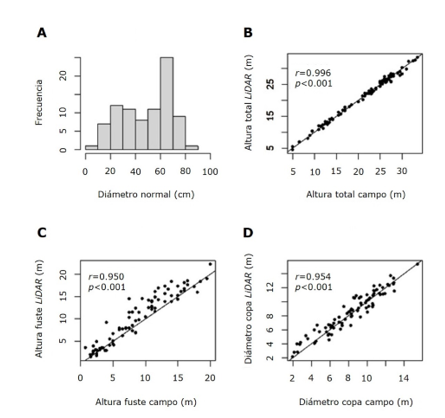 A = Histograma de frecuencia del diámetro normal; B = Correlación de la altura total; C = Correlación de la altura de fuste; D = Correlación del diámetro de copa.