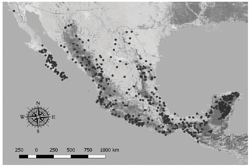 Se analizaron 599 muestras de suelos forestales del Inventario Nacional Forestal y de Suelos 2014 de la Comisión Nacional Forestal (Conafor), procedentes de diversas regiones de México (Figura 1). Las muestras fueron secadas a temperatura ambiente, posteriormente se molieron y tamizaron en mallas de 2 y 0.5 mm de abertura para obtener fracciones fina (utilizada en los análisis convencionales) y gruesa (para la captura de espectros en VIS-NIR), respectivamente. A continuación, se almacenaron, a temperatura ambiente, en botes de plástico cerrados herméticamente.