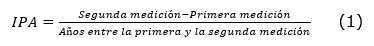La primera medición de la altura se hizo a principios de 2013, después del primer periodo de crecimiento; mientras que la primera medición del diámetro normal (a 1.30 m de altura) se efectuó a principios de 2019, cuando todos los árboles superaron la altura de 1.30 m. La altura y el diámetro normal se midieron con un flexómetro Cadena® MGA 725 y vernier digital Miltutoyo® IP67 ABSOLUTE, respectivamente. La segunda medición de ambas variables se llevó a cabo a principios de 2023, 10.5 años después del establecimiento del ensayo. El diámetro normal se determinó con una forcípula Haglöf® Mantax Blue de 400 mm y la altura con un hipsómetro Haga® W-Germany. Con los datos de la primera y segunda evaluación se calculó el Incremento periódico Anual de Altura (IPAA) y de diámetro normal (IPADN) con la siguiente ecuación (Imaña & Encinas, 2008):