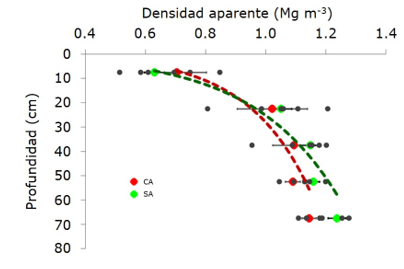 Las amplitudes en densidad aparente variaron entre 0.51 y 1.21 Mg m-3 en los rodales CA, y de 0.58 a 1.28 Mg m-3 para los rodales SA. Estos valores bajos de DA, especialmente en el suelo superficial, se explican por la naturaleza de los Andosoles y por impactos bajos sobre la compactación como resultado del aprovechamiento forestal (Binkley & Fisher, 2020). Por otra parte, estos valores de DA indican, indirectamente, suelos con buen estado físico, buen drenaje, buena aireación y que permiten un desarrollo adecuado de las raíces (Toivio et al., 2017).