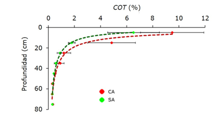 No se obtuvieron diferencias estadísticas del porcentaje de COT entre rodales CA y SA. Los valores de COT disminuyeron de forma exponencial conforme aumentó la profundidad del suelo. Esta tendencia se explica por el efecto de la descomposición de hojarasca en la parte superficial, así como el mayor aporte de raíces finas con bajos tiempos de residencia y compuestos orgánicos que se movilizan hacia las capas más profundas (Binkley & Fisher, 2020; Schlesinger & Bernhardt, 2020).
