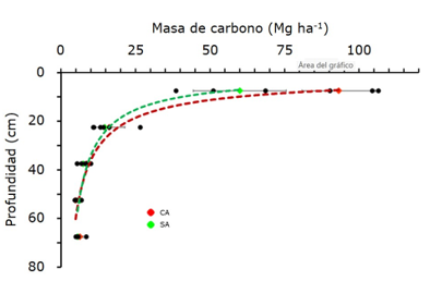 Con relación a la masa de carbono, se observó que los rodales SA presentaron una tendencia de mayor masa de carbono en el suelo superficial. Sin embargo, a profundidades mayores de 40 cm esa tendencia desaparece y la masa de carbono en rodales con y sin aprovechamiento fue similar (Figura 4). La masa de carbono del suelo estimada a 80 cm de profundidad fue de 129.1 y 93.9 Mg ha-1, para rodales CA y SA, respectivamente.