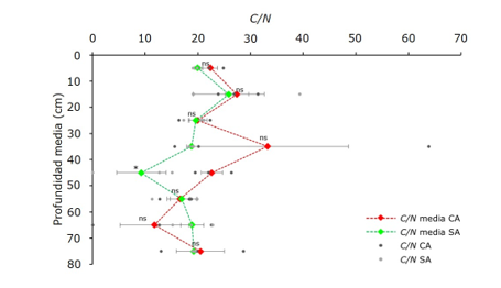 Dado que la relación C/N es un indicador de la facilidad de descomposición de la materia orgánica, los resultados indican la presencia de carbono de más fácil descomposición a 45 cm en rodales SA (Figura 5).