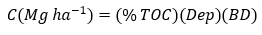 Total organic carbon (TOC) was determined using an automatic carbon analyzer (model TOC SSM 5050A Shimadzu®). The organic carbon content (% TOC), bulk density, and sampling horizon thicknesses were used to calculate carbon mass. Since the soil is volcanic, acidic, and non-reactive to HCl, no correction estimates were made for inorganic carbon (carbonates). The amount of carbon in tons or megagrams (Mg) per hectare was estimated using the following formula, which implicitly includes a unit adjustment factor: