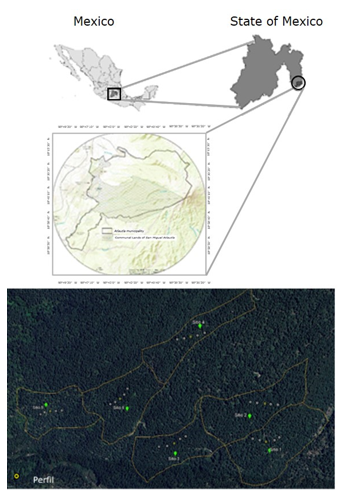 The study area was located between the extreme coordinates 19°04’58.04”-18°59’26.67” N and 98°37’46.25”-98°48’45.38” W (Figure 1), which consist of forest lands of the Communal Lands of San Miguel Atlautla, Atlautla municipality, State of Mexico. The climate is C(E)(w2)(w)b(i)g semi-cold, sub-humid, with summer rains, with winter precipitation less than 5 %, average annual temperature between 5 and 12 °C, with average annual precipitation of 800 to 1 300 mm. The soils present, according to the 1988 FAO-UNESCO classification, are eutric Regosol and vitric Andosol with a coarse texture (Instituto de Información e Investigación Geográfica, Estadística y Catastral del Estado de México [Igecem], 2019). According to Series VII-Land Use and Vegetation of the National Institute of Statistics and Geography (Instituto Nacional de Estadística y Geografía [Inegi], 2018), the vegetation consists of fir forest [Abies religiosa (Kunth) Schltdl. & Cham.].