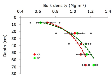 Bulk density ranged from 0.51 to 1.21 Mg m-3 in the CA stands and from 0.58 to 1.28 Mg m-3 in the SA stands. These low bulk density values, especially in the topsoil, are explained by the nature of the Andisols and by low impacts on compaction resulting from logging (Binkley & Fisher, 2020). Furthermore, these bulk density values indirectly indicate soils with good physical condition, good drainage, good aeration, and that allow for adequate root development (Toivio et al., 2017).