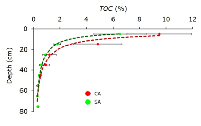 No statistically significant differences in total organic carbon (TOC) percentage were found between CA and SA stands. TOC values decreased exponentially with increasing soil depth. This trend is explained by the effect of litter decomposition in the surface layer, as well as the greater contribution of fine roots with short residence times and organic compounds that are mobilized to deeper layers (Binkley & Fisher, 2020; Schlesinger & Bernhardt, 2020).