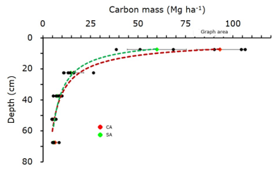 Regarding carbon mass, SA stands showed a trend toward greater carbon mass in the surface soil. However, at depths greater than 40 cm, this trend disappears, and the carbon mass in stands with and without harvesting was similar (Figure 4). The estimated soil carbon mass at 80 cm depth was 129.1 and 93.9 Mg ha-1 for CA and SA stands, respectively.