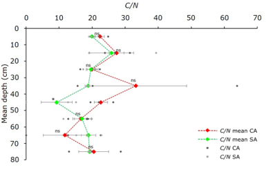 Except for the depth of 45 cm, no statistically significant differences were found between CA and SA stands with respect to the C/N ratio. In general, there is a trend toward a higher C/N ratio in CA stands.