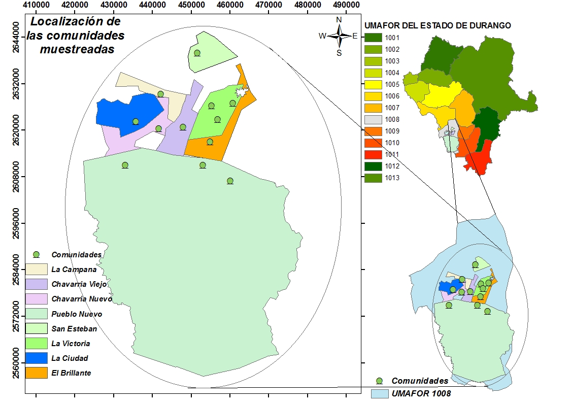 Se seleccionaron 12 comunidades representativas de las condiciones de los bosques de la región, donde para el registro de las variables de control del sitio: ubicación, presencia y abundancia de las especies, se eligieron de manera aleatoria 269 sitios circulares de 0.1 ha.