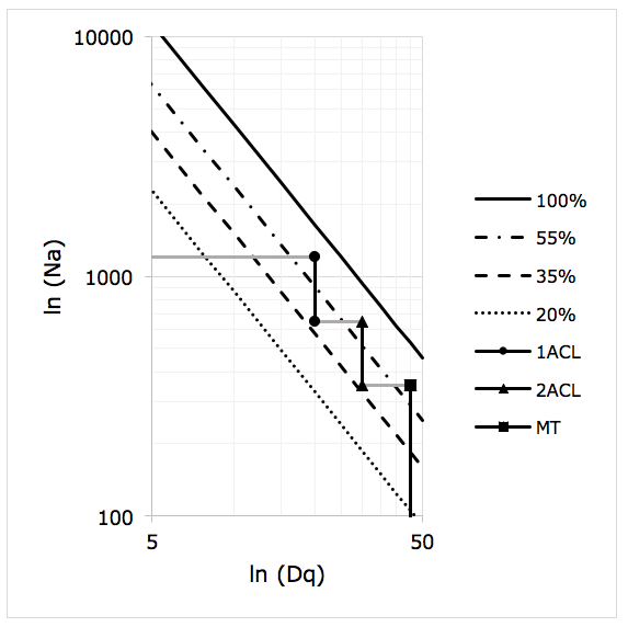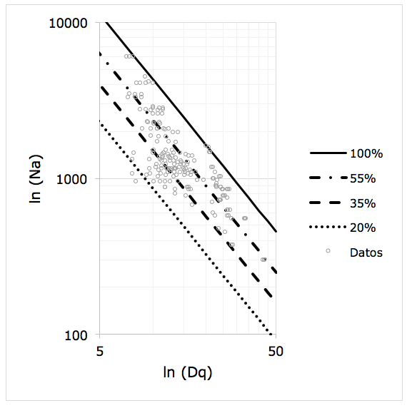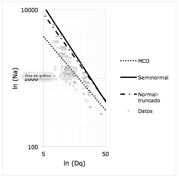 En teoría, la línea de referencia tamaño-densidad máxima debería estar representada por el límite superior de los puntos o datos seleccionados. Uno de los métodos estadísticos tradicionales para estimar la línea del autoaclareo es mediante mínimos cuadrados ordinarios (MCO), en los que el número de árboles por hectárea (Na) es una función directa del diámetro cuadrático promedio (Dq). Sin embargo, esta función describe una línea de tendencia central de los datos observados. Con este método, se tiene que hacer variar el valor del intercepto para estimar de manera adecuada el límite superior del autoaclareo, por lo que resulta subjetivo, es decir, se calculan proporcionalmente los valores de las líneas para los índices de densidad (Weller, 1987; Vargas, 1999; Santiago et al., 2013).
