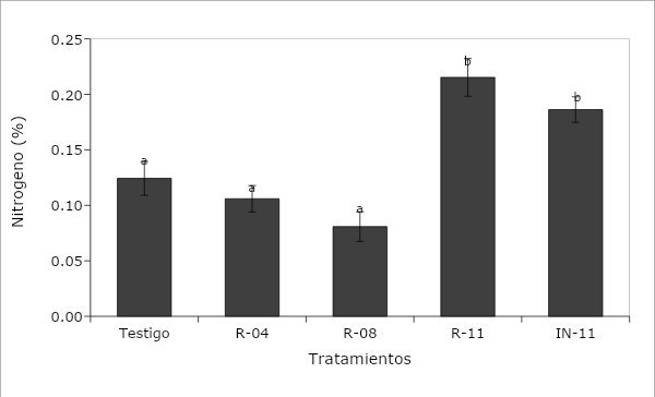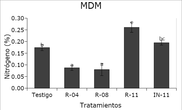 MDM = MDS; Nitrógeno = Nitrogen; Testigo = Control; IN-11 = BA-11; Tratamientos = Treatments