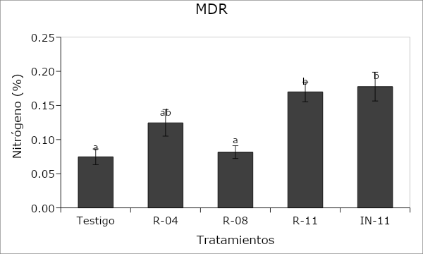 MDR= RDS; Testigo = Control; Tratamientos = Treatments; Nitrógeno = Nitrogen; IN-11 = BA-11