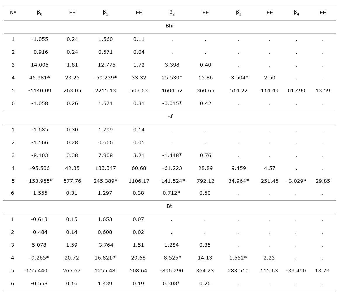N° = Número de modelo; ,…,= Parámetros estimados; EE = Error estándar de los parámetros.; * = Parámetros no significativos.