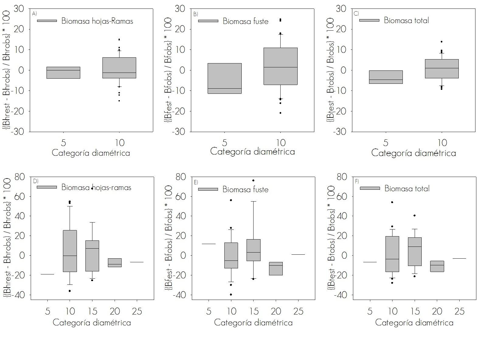El modelo 3 registró un error mayor en la categoría de 10 cm en Bhr (Figura 2A); caso contrario para Bt (Figura 2C) en la categoría de 5 cm; y en Bf (Figura 2B) al modelo 4 le correspondió el error más alto en la categoría de 5 cm. Aunque para P. halepensis, el modelo 2 registró un menor error en la categoría 15 del componente fuste (Figura 2E) en comparación con el resto de las categorías. En Bhr (Figura 2D) y Bt (Figura 2F) el modelo tuvo menores errores en las categorías de 10 cm.